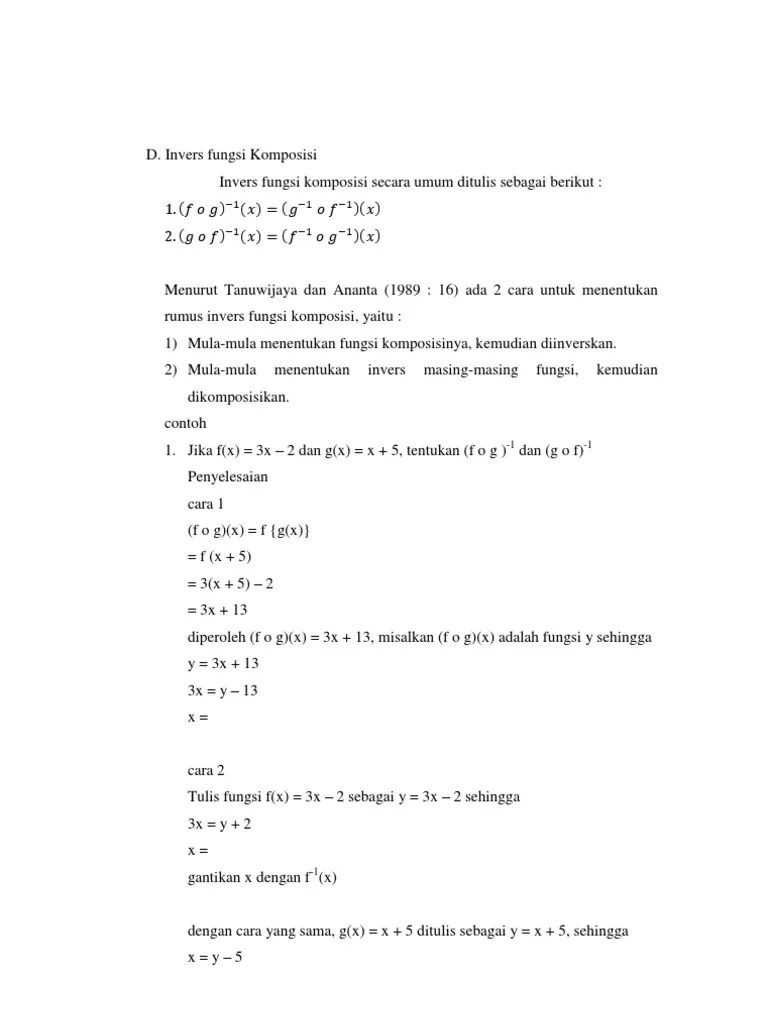 Pada artikel kali ini kita akan membahas mengenai invers fungsi secara lebih lanjut, dibaca sampai akhir ya! Pengertian fungsi komposisi dan fungsi invers fungsi komposisi dari dua jenis fungsi f(x) dan g(x) kita dapat membentuk sebuah fungsi baru dengan menggunakan sistem operasi komposisi. Semoga dengan memahami latihan soal di atas, anda bisa meningkatkan kemampuan anda untuk menyelesaikan persoalan fungsi komposisi lainnya. F ( y) = f − 1 ( y). Ubahlah variabel y dengan x sehingga akan didapatkan rumus fungsi invers f − 1(x) f − 1 ( x).